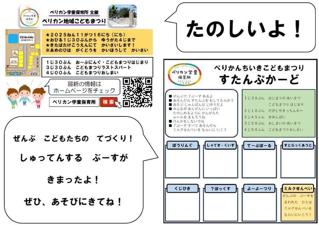 - ペリカン地域こどもまつり〜こどもブースいよいよ明日、ペリカン地域こどもまつり開催します!晴れそうでよかったです☀️ こどもブースは7つあります。 💙… 続きを読む: ペリカン地域こどもまつり〜こどもブース