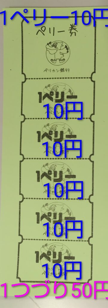 金券は1ペリー(ペリカン学童の通貨の通称です☺️)10円として、5枚つづりの50円ごとで購入できます。